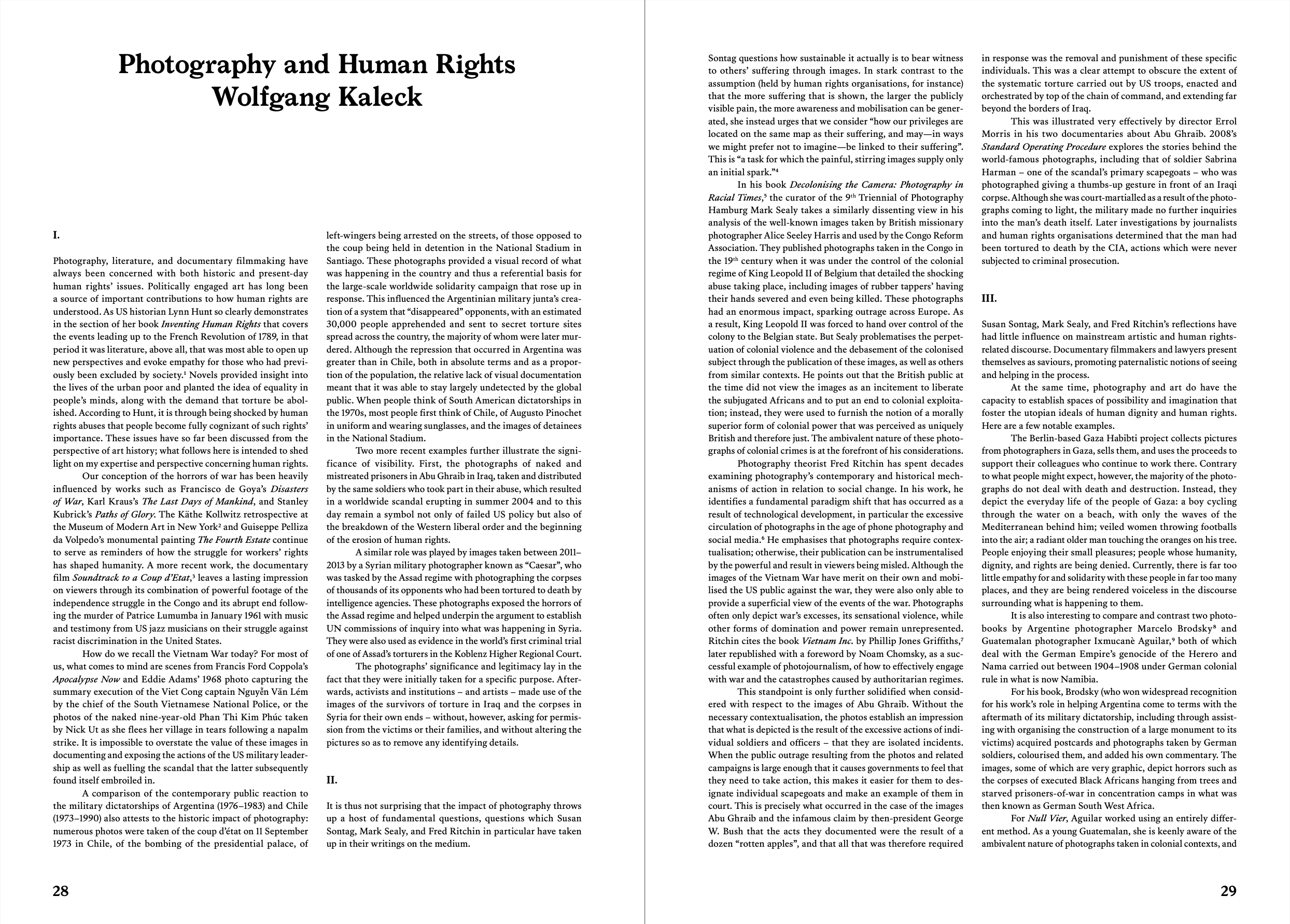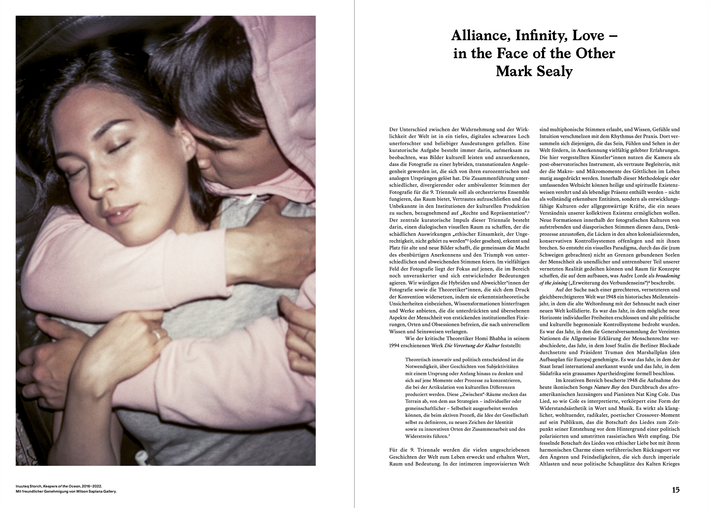 Die erste Publikation mit dem Titel Alliance, Infinity, Love – In the Face of the Other erschien im November 2025 anlässlich des gleichnamigen Internationalen Symposiums in Hamburg. Sie enthält zahlreiche Reproduktionen von Werken von Künstler*innen der 9. Triennale sowie drei Essays: Mark Sealy skizziert die kuratorische Vision; Aruna D’Souza untersucht die Idee von Empathie als Grundlage solidarischen Handelns; und Wolfgang Kaleck reflektiert über das Verhältnis von Fotografie und Menschenrechten – sowohl historisch als auch in der Gegenwart. Darüber hinaus bietet die Publikation einen Ausblick auf das Festivalprogramm.